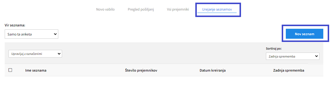 Sezname prejemnikov lahko urejate in dodajate v zavihku 'Urejanje seznamov'. S klikom na 'Nov seznam', se vam odpre vmesnik za ustvarjanje novega seznama.